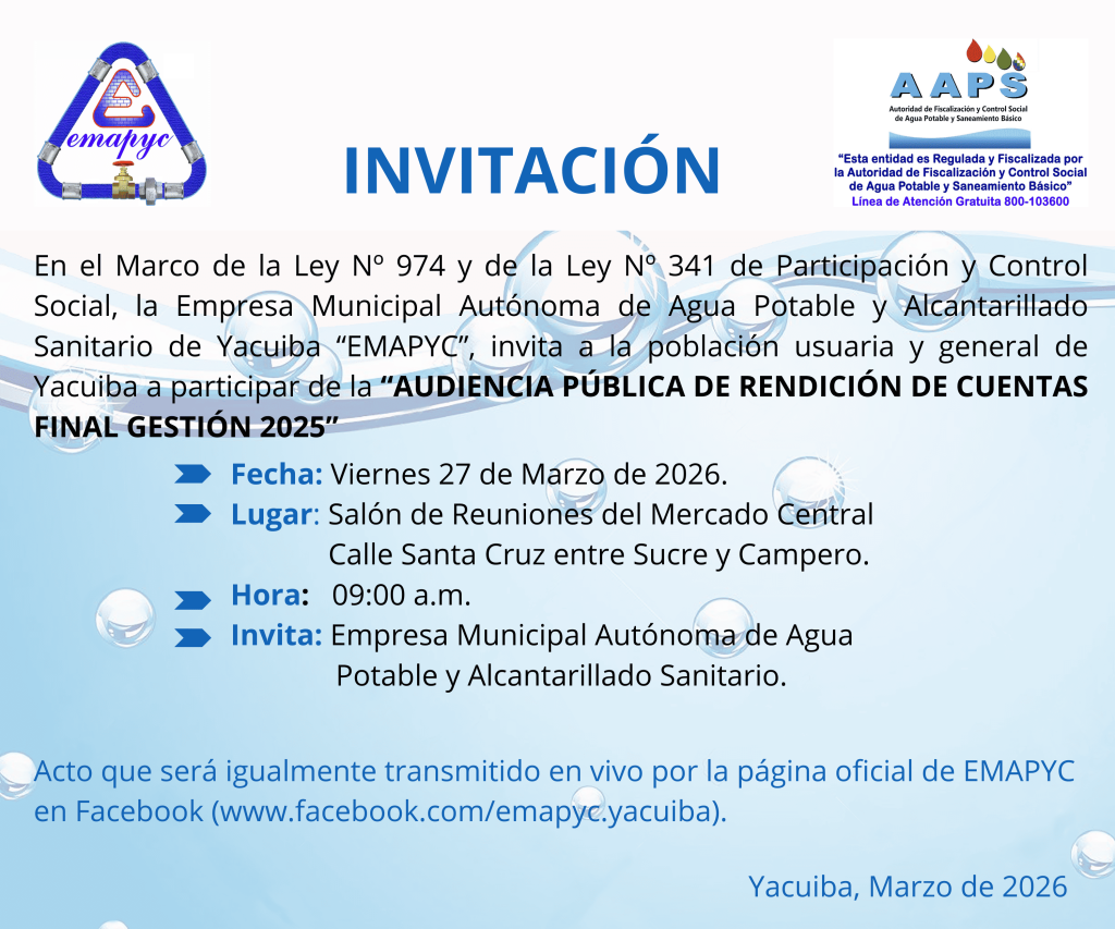 Servicios Transparencia Reclamos Contacto Nuestros Servicios Agua Potable Captación, tratamiento y distribución de agua potable a hogares y empresas de Yacuiba. Alcantarillado Sanitario Red de alcantarillado para el saneamiento básico de toda la ciudad de Yacuiba. Aguas Residuales Recolección y tratamiento de aguas residuales para proteger el medio ambiente de Yacuiba. COMUNICADOS INSTITUCIONALES Rendición de Cuentas Publicas Final 2025 Informe anual de gestión presentado a la ciudadanía. Lectura de Medidores Se está procediendo a tomar las lecturas de medidores, para su posterior facturación. Trabajo en Curso Se están realizando trabajos por fuga de agua en red matriz. EMAPYC Empresa Municipal Autónoma de Agua Potable y Alcantarillado de Yacuiba. Regulada y fiscalizada por AAPS. Contacto ☎ 04-6822374📍 Yacuiba, Tarija — Bolivia🕐 Lun–Vie: 07:30–12:00 15:00-18:30 Accesos rápidos Solicitud de Servicios Transparencia Normativa
